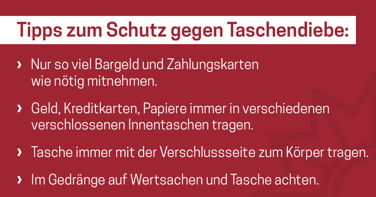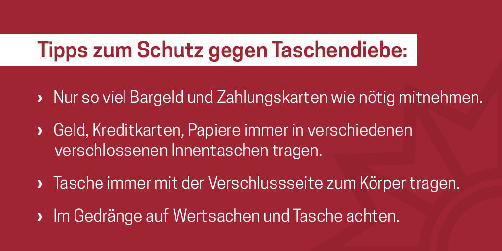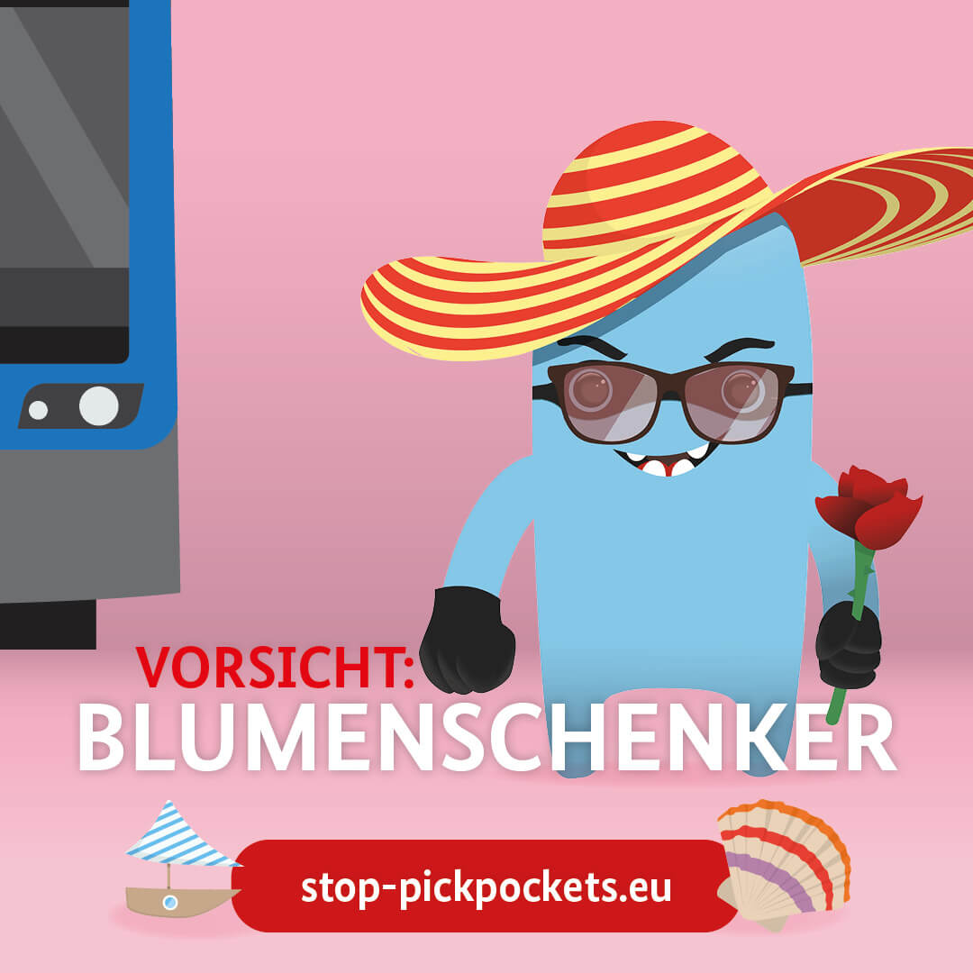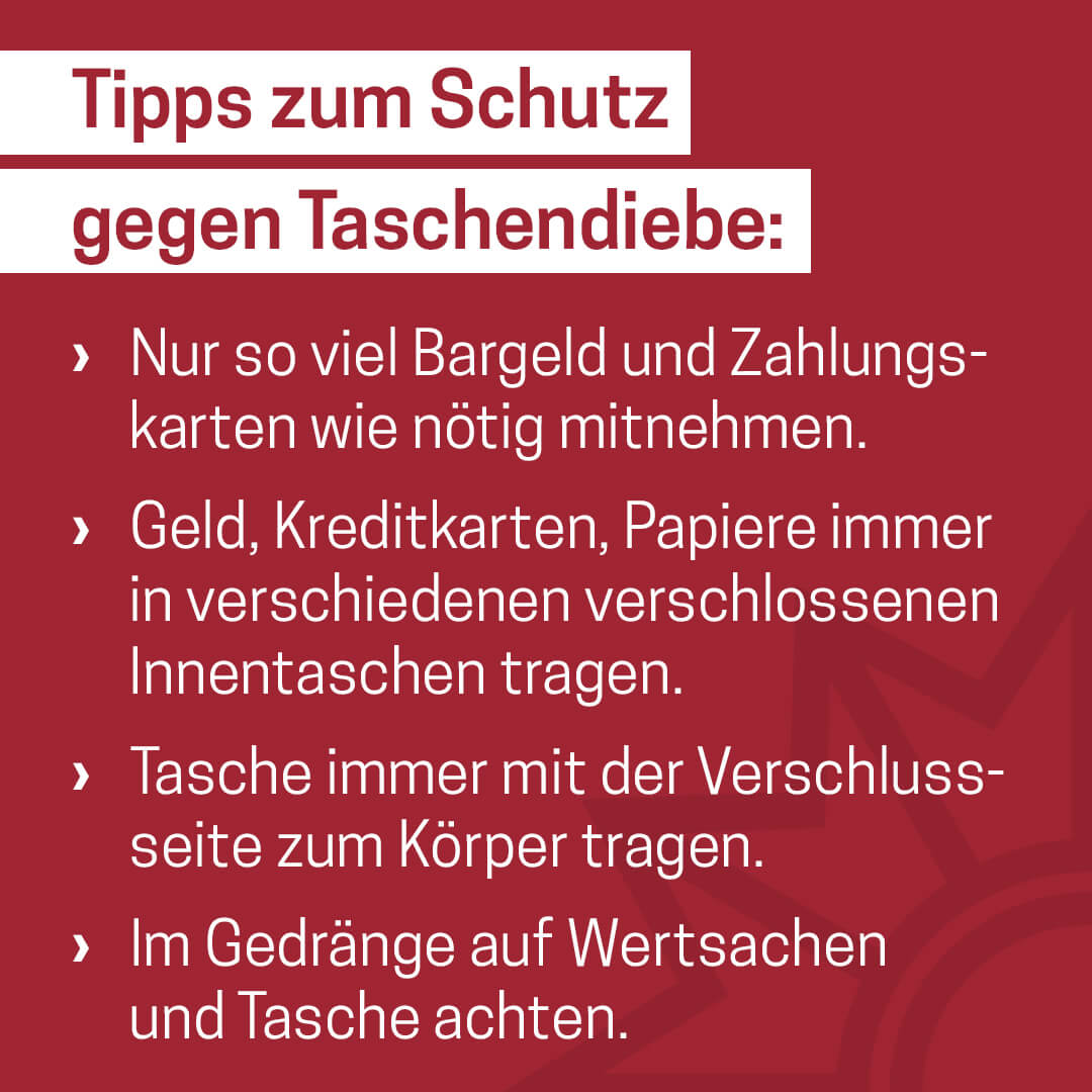 Das Medienpaket „Stop Pickpockets - Taschendiebstahl im Sommerurlaub“ ist eine thematische Zusammenstellung aus Bild- und/ oder Textpostings für die Social Media Kanäle Facebook, Instagram und X. Wir stellen Ihnen die Beiträge zur freien Verfügung bereit. Nutzen Sie diese selbst oder leiten Sie die Postings an Ihre zuständige Social Media Stelle weiter. Wie und ob Sie die Beiträge veröffentlichen, können Sie individuell entscheiden. Texte und Hashtags können Sie frei nutzen und für Ihre Anforderungen anpassen.