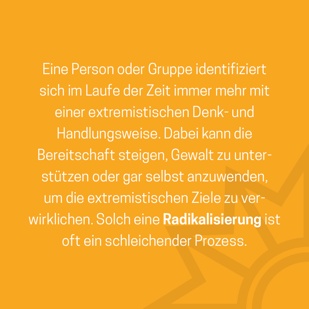 Das Medienpaket „Was bedeutet Radikalisierung?“ ist eine thematische Zusammenstellung aus Bild- und/ oder Textpostings für die Social Media Kanäle Facebook, Instagram und X. Wir stellen Ihnen die Beiträge zur freien Verfügung bereit. Nutzen Sie diese selbst oder leiten Sie die Postings an Ihre zuständige Social Media Stelle weiter. Wie und ob Sie die Beiträge veröffentlichen, können Sie individuell entscheiden. Texte und Hashtags können Sie frei nutzen und für Ihre Anforderungen anpassen.
