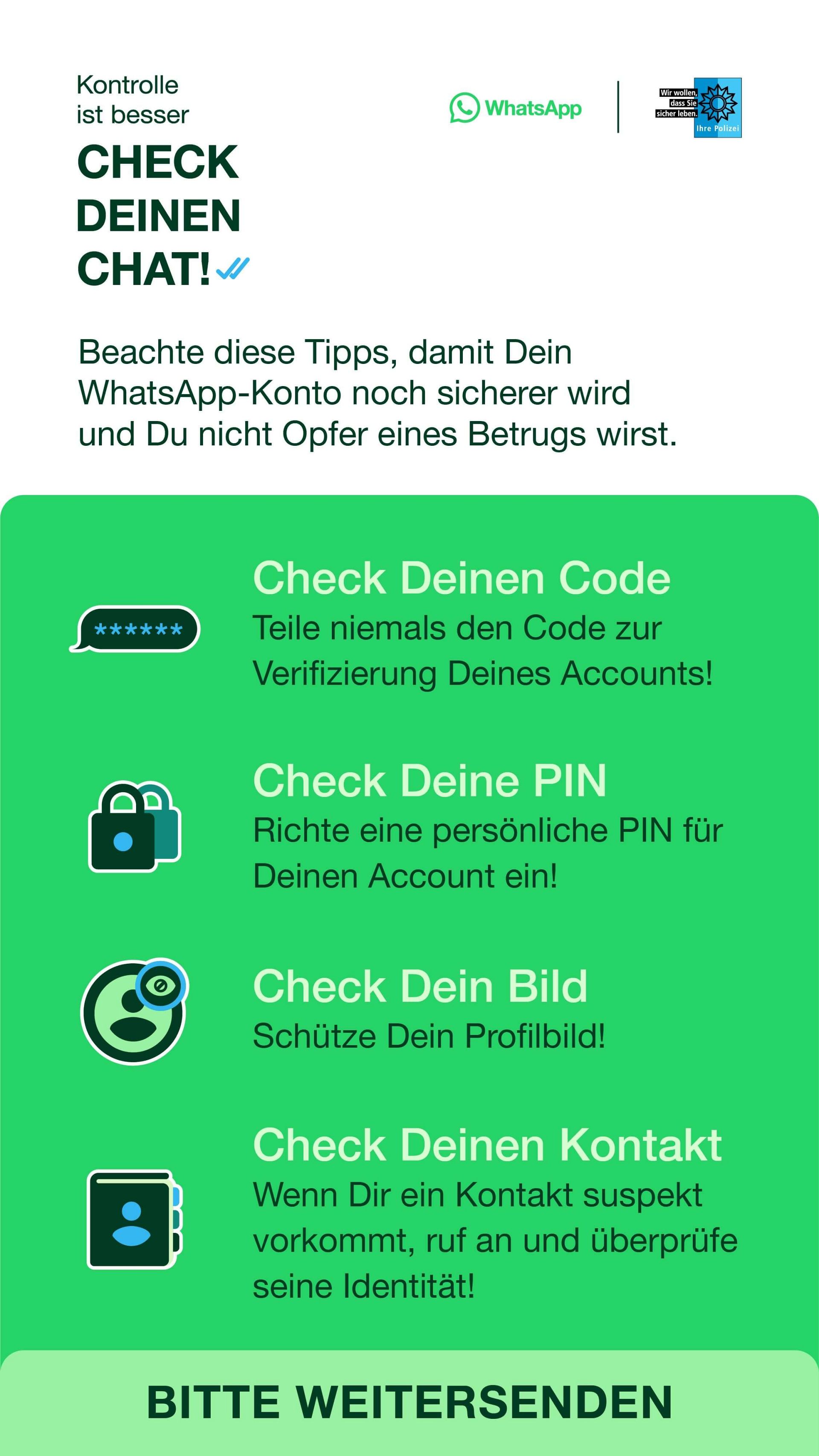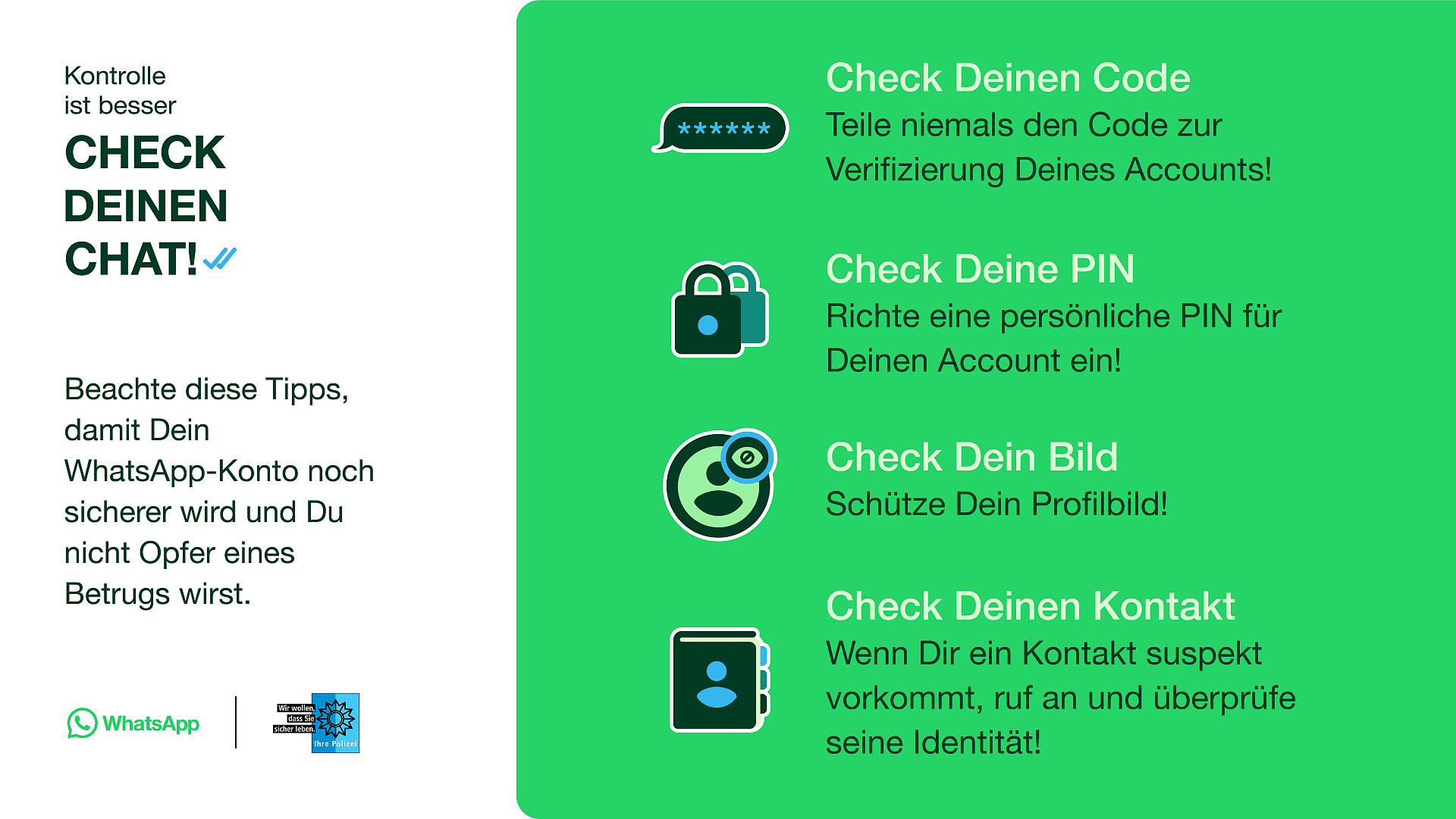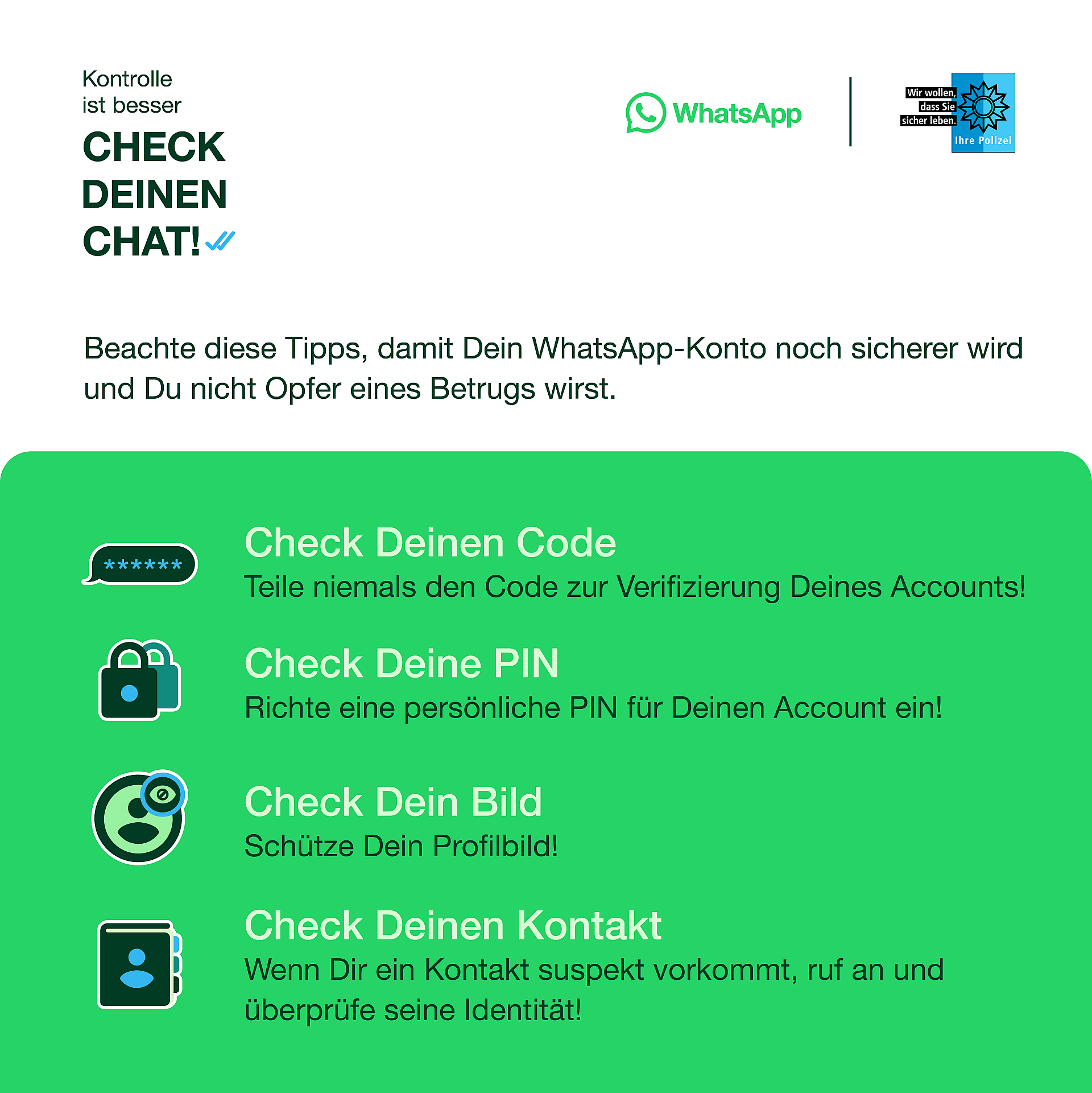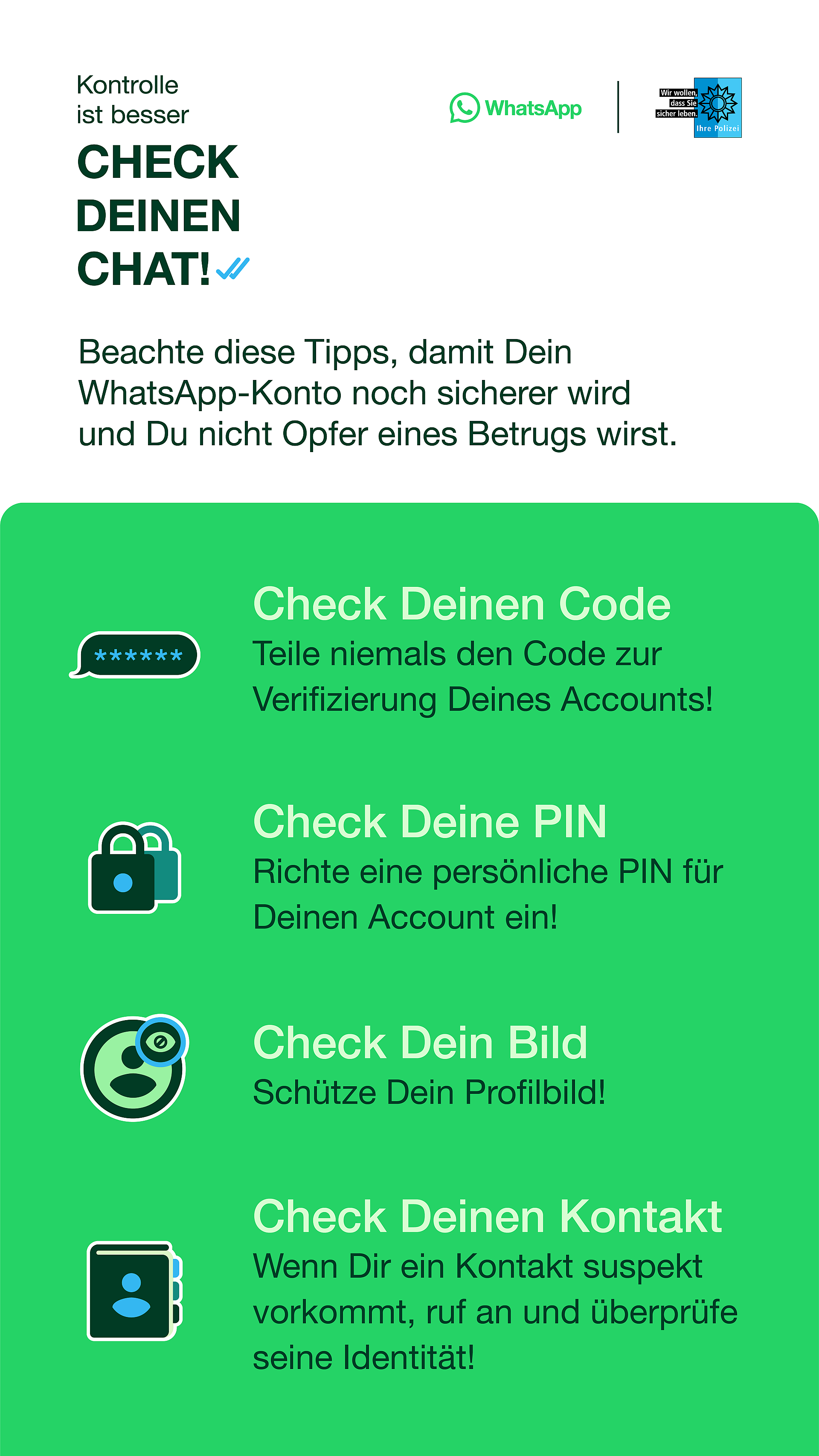 Das Medienpaket „Kontrolle ist besser - Check Deinen Chat“ ist eine thematische Zusammenstellung aus Bild- und/ oder Textpostings für die Social Media Kanäle Facebook, Instagram und X. Wir stellen Ihnen die Beiträge zur freien Verfügung bereit. Nutzen Sie diese selbst oder leiten Sie die Postings an Ihre zuständige Social Media Stelle weiter. Wie und ob Sie die Beiträge veröffentlichen, können Sie individuell entscheiden. Texte und Hashtags können Sie frei nutzen und für Ihre Anforderungen anpassen.