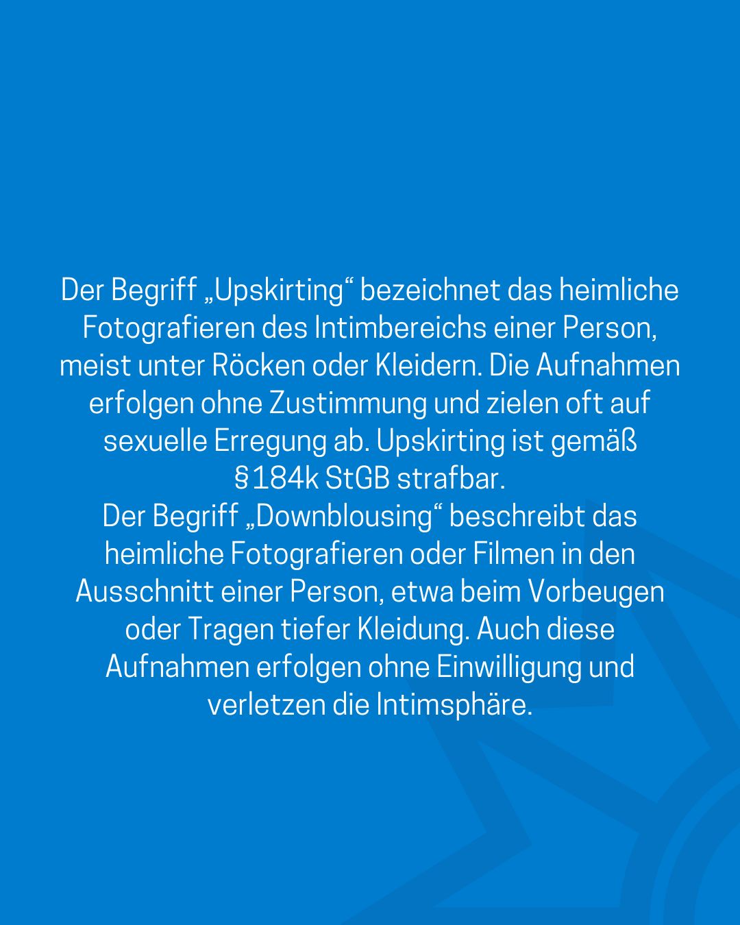 Das Medienpaket „Upskirting und Downblousing: Was ist das eigentlich?“ ist eine thematische Zusammenstellung aus Bild- und/ oder Textpostings für die Social Media Kanäle Facebook, Instagram und X. Wir stellen Ihnen die Beiträge zur freien Verfügung bereit. Nutzen Sie diese selbst oder leiten Sie die Postings an Ihre zuständige Social Media Stelle weiter. Wie und ob Sie die Beiträge veröffentlichen, können Sie individuell entscheiden. Texte und Hashtags können Sie frei nutzen und für Ihre Anforderungen anpassen.
