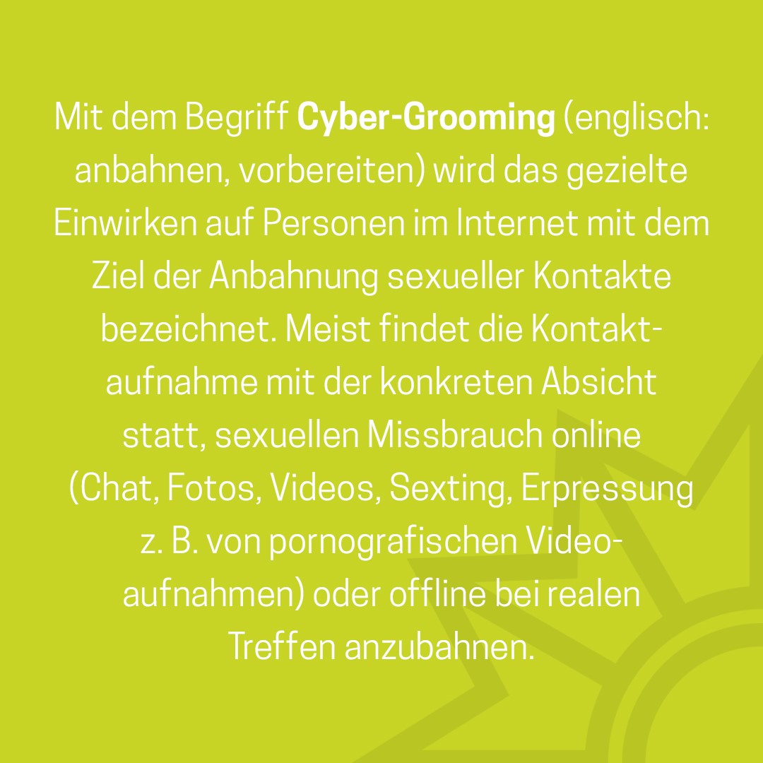 Das Medienpaket „Was versteht man unter Cybergrooming?“ ist eine thematische Zusammenstellung aus Bild- und/ oder Textpostings für die Social Media Kanäle Facebook, Instagram und X. Wir stellen Ihnen die Beiträge zur freien Verfügung bereit. Nutzen Sie diese selbst oder leiten Sie die Postings an Ihre zuständige Social Media Stelle weiter. Wie und ob Sie die Beiträge veröffentlichen, können Sie individuell entscheiden. Texte und Hashtags können Sie frei nutzen und für Ihre Anforderungen anpassen.