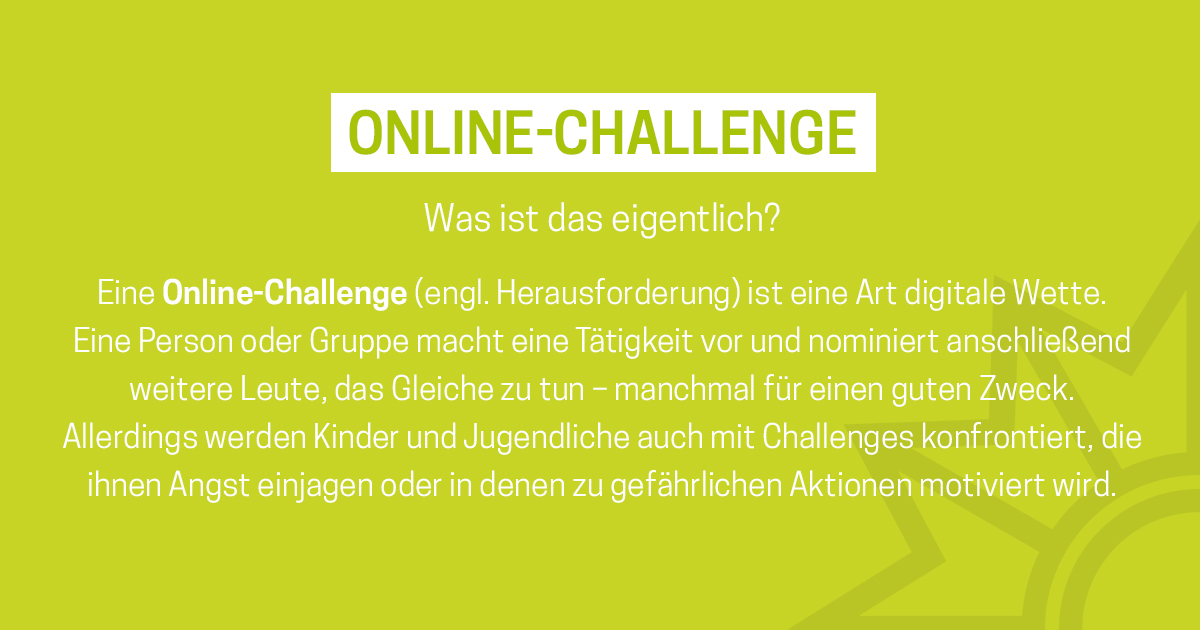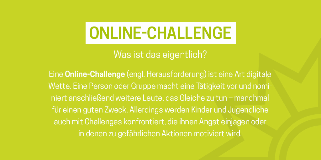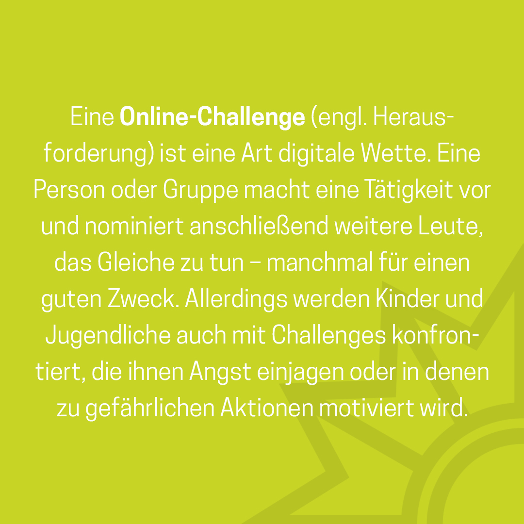 Das Medienpaket „Was sind eigentlich Online-Challenges?“ ist eine thematische Zusammenstellung aus Bild- und/ oder Textpostings für die Social Media Kanäle Facebook, Instagram und X. Wir stellen Ihnen die Beiträge zur freien Verfügung bereit. Nutzen Sie diese selbst oder leiten Sie die Postings an Ihre zuständige Social Media Stelle weiter. Wie und ob Sie die Beiträge veröffentlichen, können Sie individuell entscheiden. Texte und Hashtags können Sie frei nutzen und für Ihre Anforderungen anpassen.