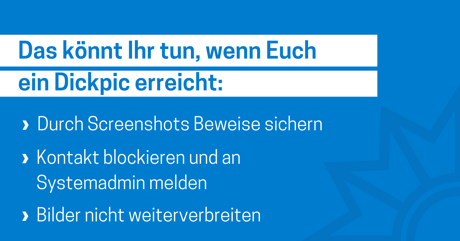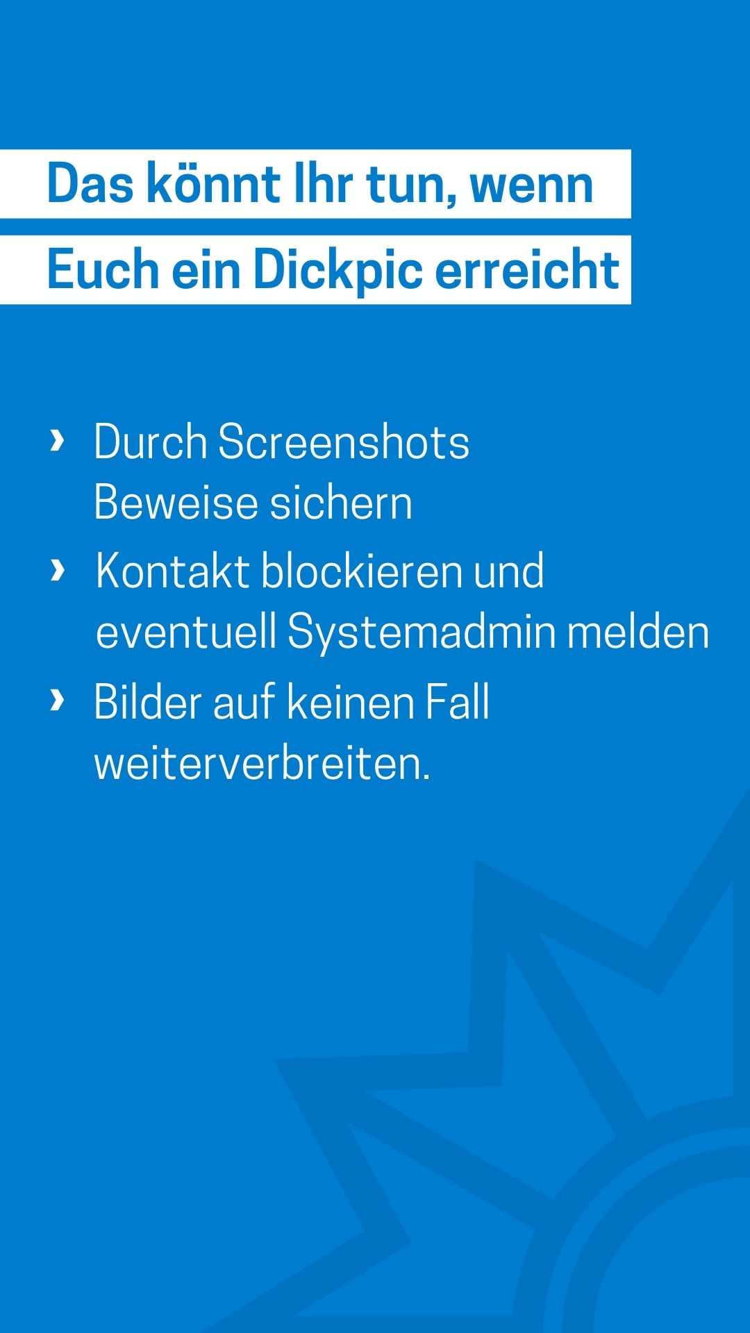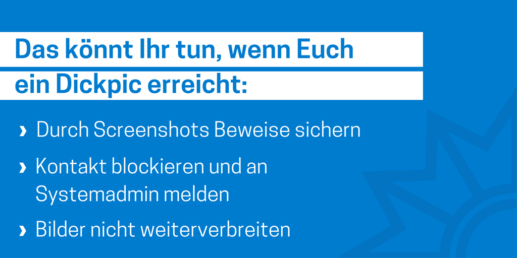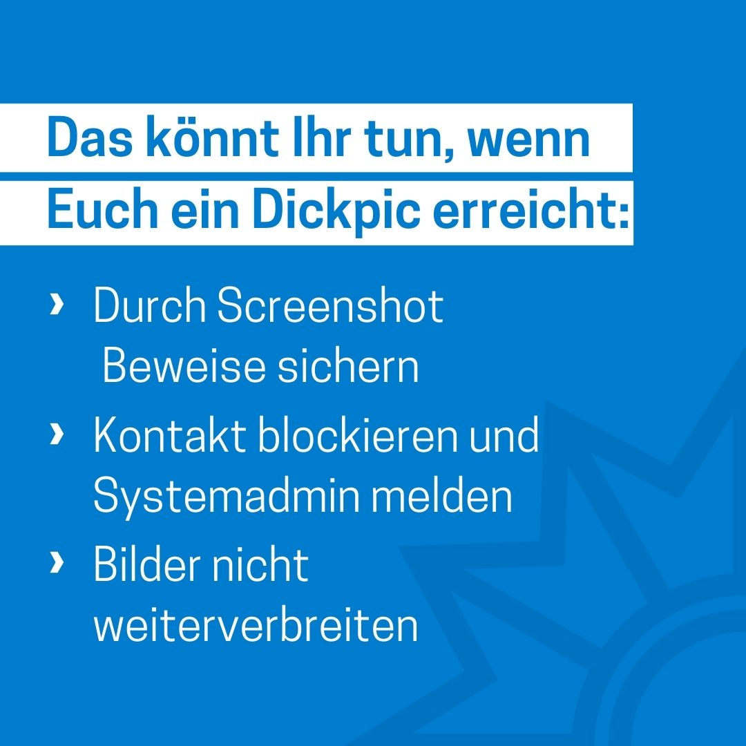Das Medienpaket „Dickpic/Penisbilder“ ist eine thematische Zusammenstellung aus Bild- und/ oder Textpostings für die Social Media Kanäle Facebook, Instagram und X. Wir stellen Ihnen die Beiträge zur freien Verfügung bereit. Nutzen Sie diese selbst oder leiten Sie die Postings an Ihre zuständige Social Media Stelle weiter. Wie und ob Sie die Beiträge veröffentlichen, können Sie individuell entscheiden. Texte und Hashtags können Sie frei nutzen und für Ihre Anforderungen anpassen.