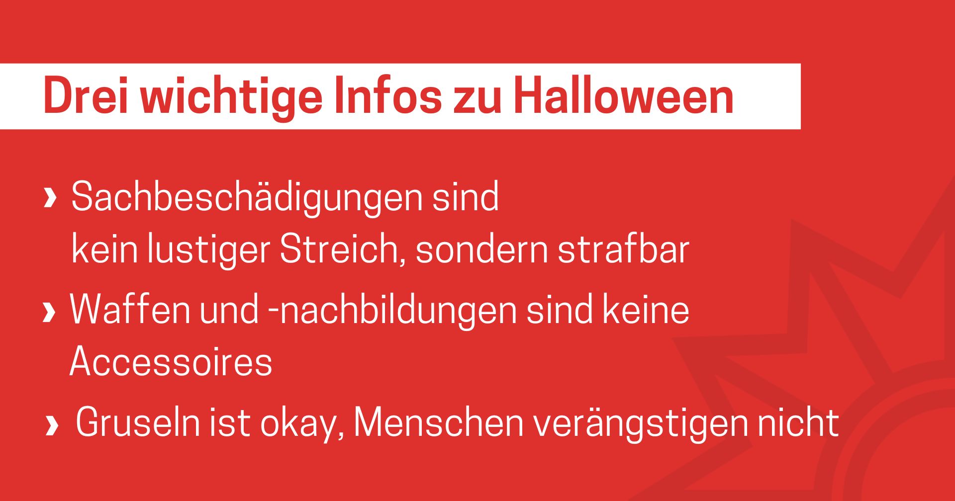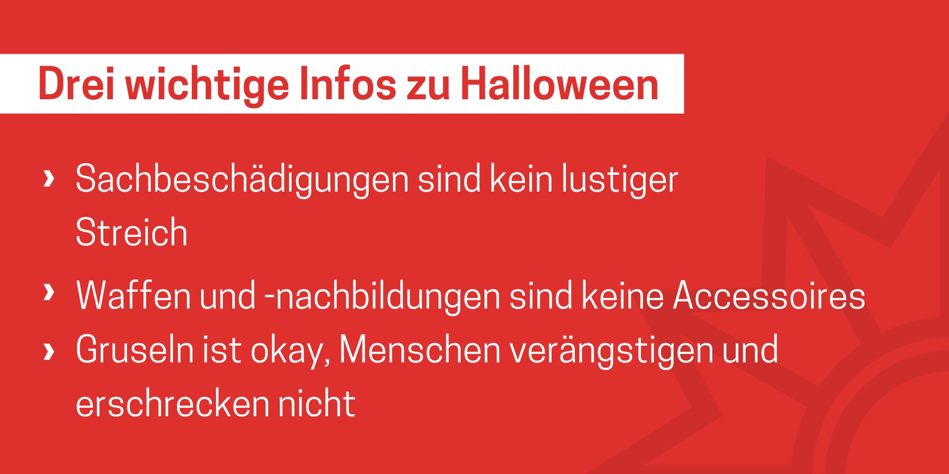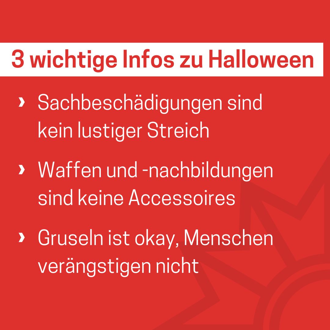 Das Medienpaket „Drei wichtige Infos zu Halloween“ ist eine thematische Zusammenstellung aus Bild- und/ oder Textpostings für die Social Media Kanäle Facebook, Instagram und X. Wir stellen Ihnen die Beiträge zur freien Verfügung bereit. Nutzen Sie diese selbst oder leiten Sie die Postings an Ihre zuständige Social Media Stelle weiter. Wie und ob Sie die Beiträge veröffentlichen, können Sie individuell entscheiden. Texte und Hashtags können Sie frei nutzen und für Ihre Anforderungen anpassen.