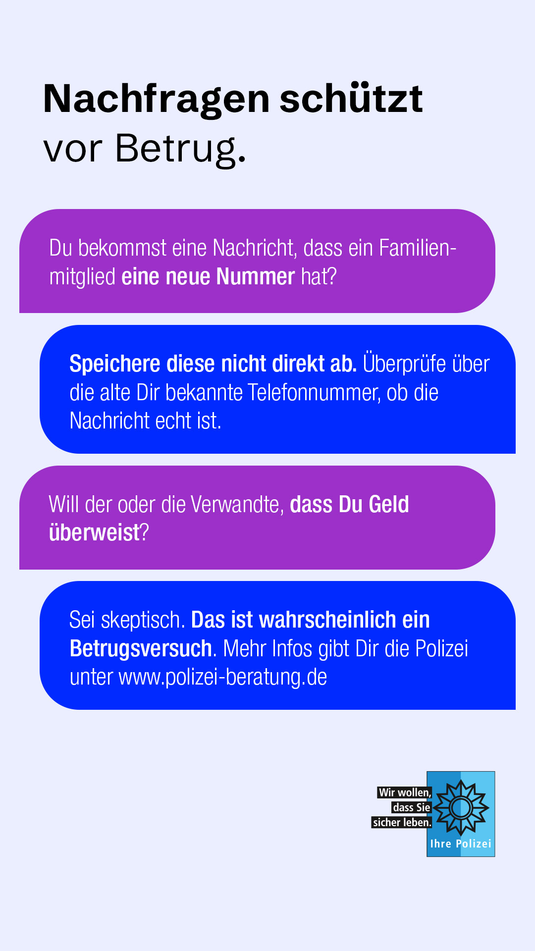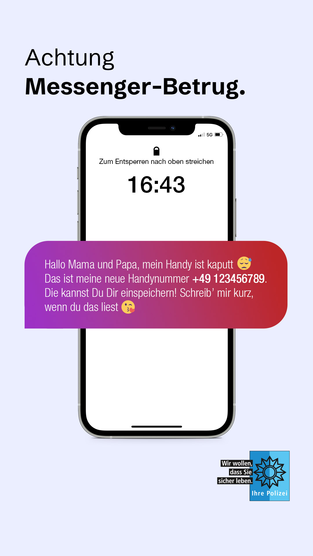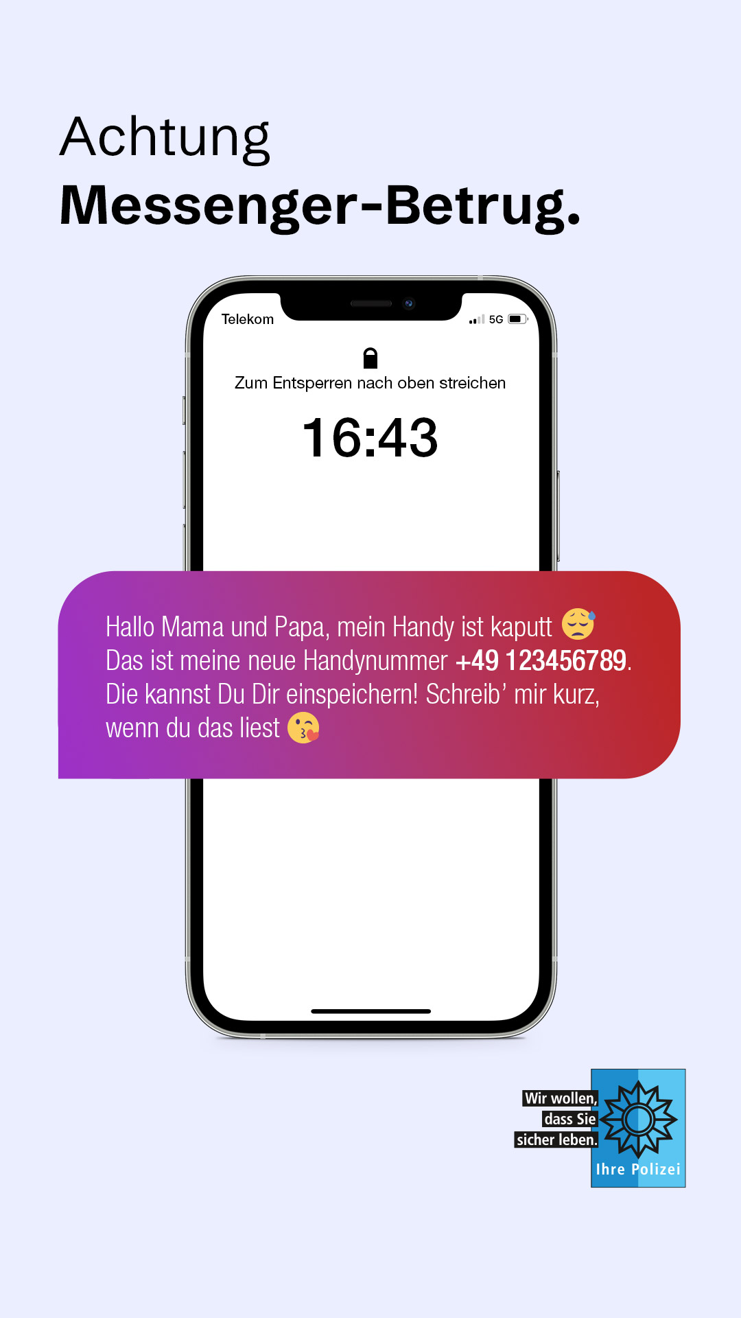 Das Medienpaket „Messenger-Betrug: Warne Dein Umfeld“ ist eine thematische Zusammenstellung aus Bild- und/ oder Textpostings für die Social Media Kanäle Facebook, Instagram und X. Wir stellen Ihnen die Beiträge zur freien Verfügung bereit. Nutzen Sie diese selbst oder leiten Sie die Postings an Ihre zuständige Social Media Stelle weiter. Wie und ob Sie die Beiträge veröffentlichen, können Sie individuell entscheiden. Texte und Hashtags können Sie frei nutzen und für Ihre Anforderungen anpassen.